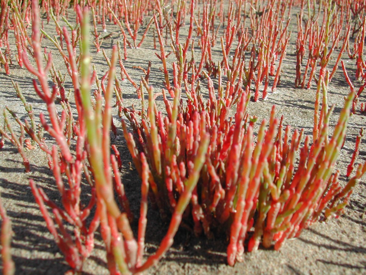 Étonnantes plantes que les salicornes ! Regardez bien leurs rameaux charnus, ils stockent de l’eau en vue d’abaisser la concentration en sel des tissus de la plante, adaptation lui permettant de coloniser les milieux les plus salés. Certaines espèces de la famille étaient autrefois récoltées et brûlées pour fabriquer de la soude.