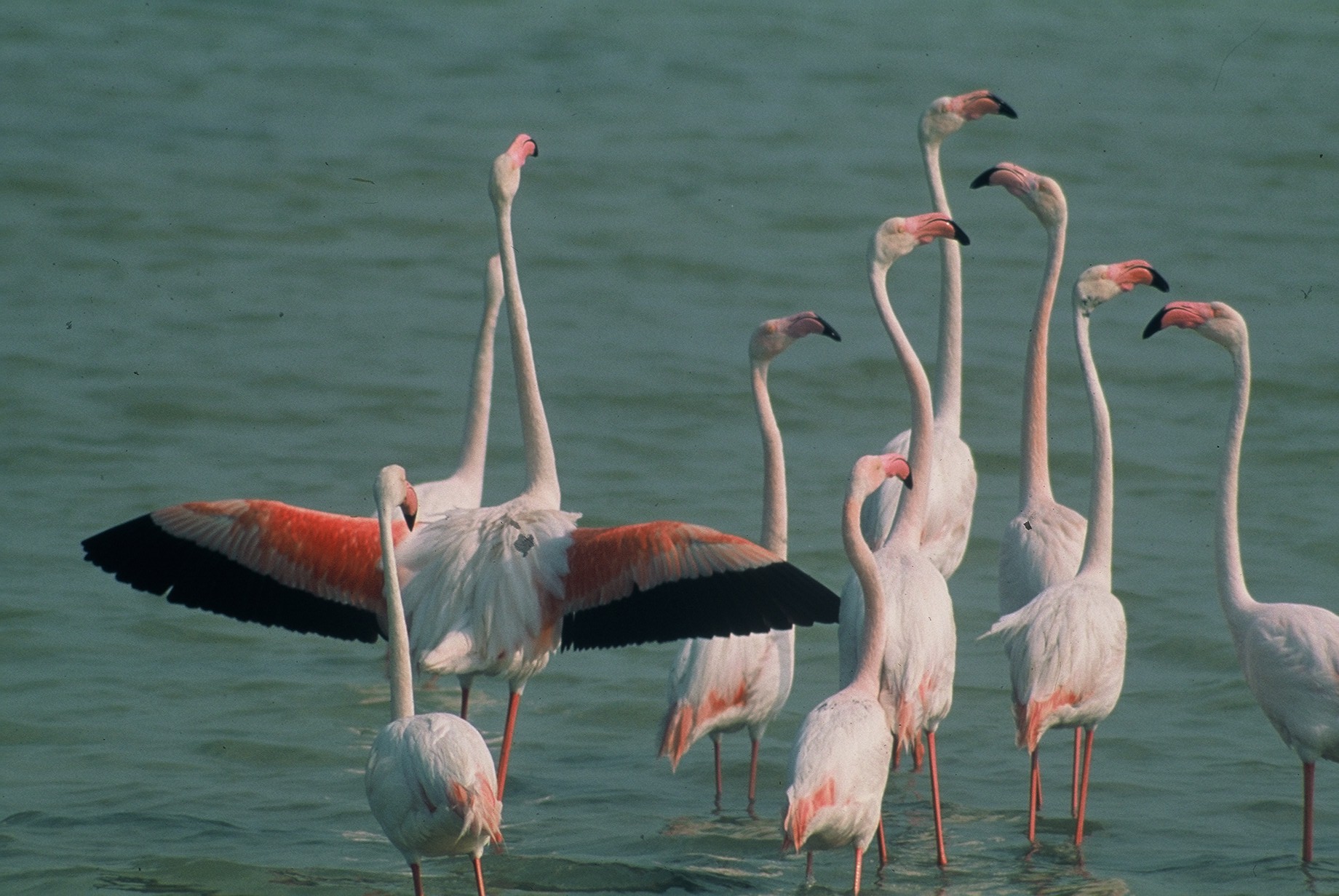 La curiosité de sa morphologie et sa couleur extravagante ne cessent pas d’étonner. Pour cet oiseau spécialiste de l’exploitation des eaux saumâtres, la Camargue est un bastion - jusqu’à 30 000 individus en été - et le seul lieu de reproduction annuel régulier en Europe depuis qu’un îlot de nidification a été aménagé en 1970 sur l’étang du Fangassier (salins de Giraud). Sa couleur lui vient des pigments de carotène de sa nourriture : petits crustacés planctoniques (Artemia salina) et algues (Dunaliella) qui colorent les salines en rose d’avril à août.