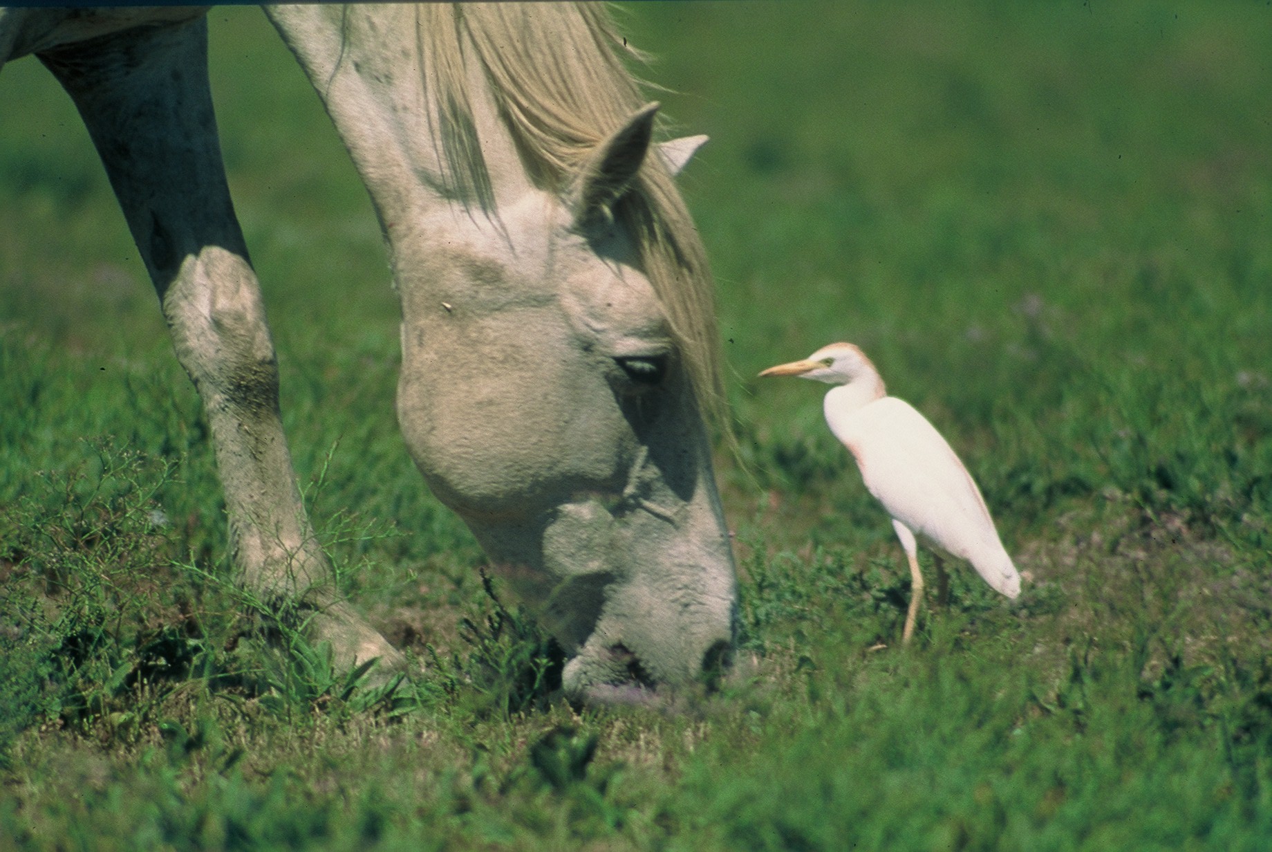 Ce héron blanc (Bubulcus ibis), souvent perché sur la croupe des chevaux, s’est installé en Camargue dans les années 1950. Sa population locale, renforcée par l’immigration d’oiseaux espagnols, a sans doute profité du développement de la riziculture. Plus de 2 000 couples nichent aujourd’hui dans le delta. Ne le confondez pas avec l’aigrette garzette plus élancée qui fréquente davantage les zones humides et les étangs.