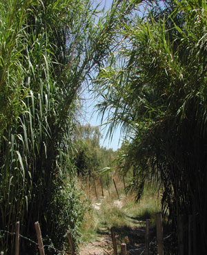 La canne de Provence (Arundo donax) est un roseau robuste qui forme de véritables haies brise-vent. Le mouvement de ces haies par fort mistral est un véritable spectacle. Sa forte taille - 2 à 5 m de haut - et sa tige ligneuse ont suscité en Camargue une tentative de culture pour la production de pâte à papier au début des années 1970 (300 ha en 1977). Faute d’une rentabilité suffisante, elle échoua. La canne de Provence est aussi utilisée sèche en palissade ou «cannisse».