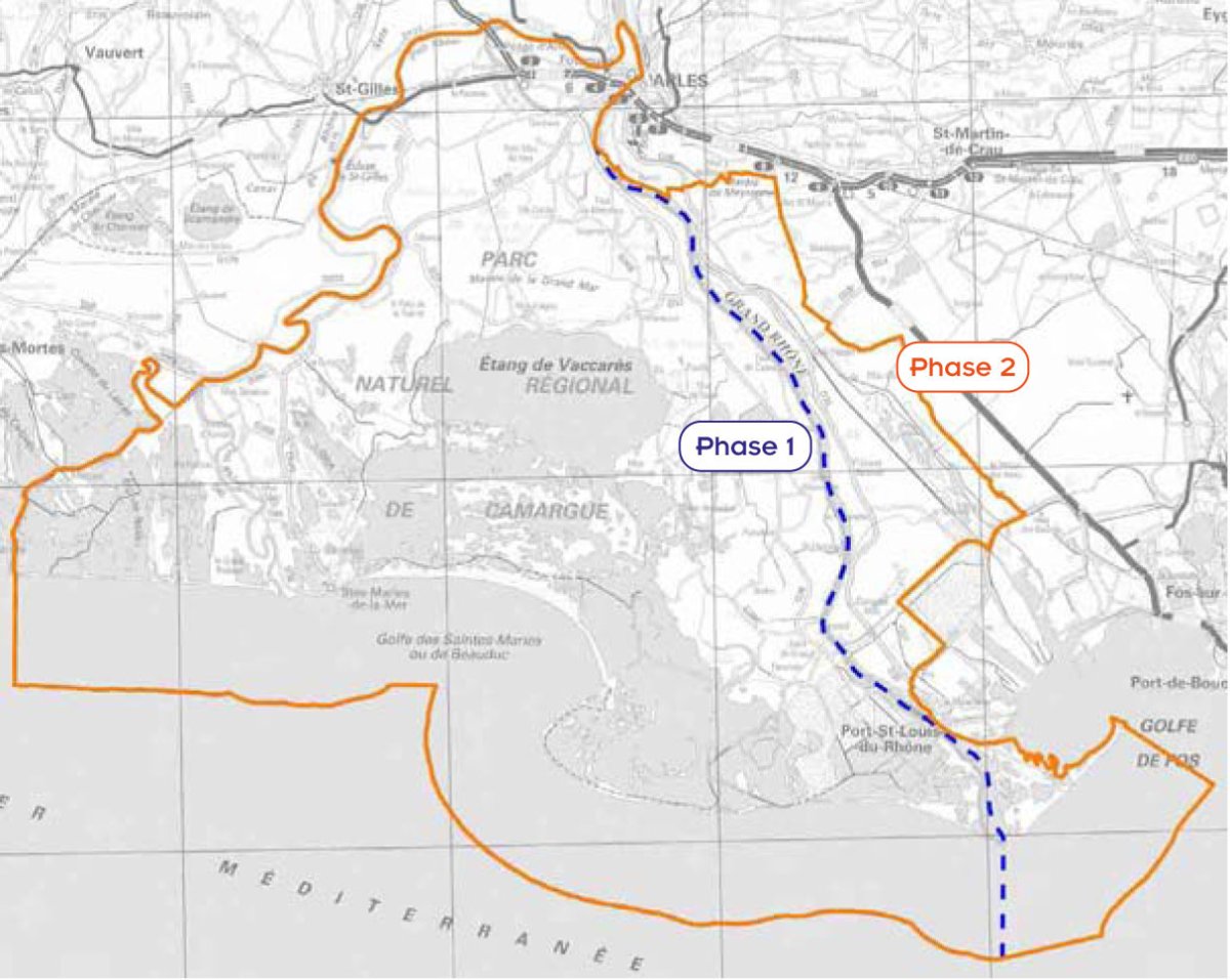 Cette dynamique se poursuit lors de la seconde phase du Contrat (2017 à 2019), qui porte sur un périmètre étendu aux territoires en rive gauche du Grand Rhône et qui inclut une partie maritime (3 milles marins). Au plan administratif, les communes des Stes-Maries-de-la-Mer (en totalité), d’Arles et Port-St-Louis-du-Rhône (en partie) sont concernées.