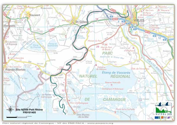 Le site Natura 2000 « Petit Rhône » est exclusivement aquatique. Il correspond au chenal du Petit Rhône, depuis la diffluence en Arles jusqu'à l'embouchure, soit un linéaire d'environ 60 km pour une superficie totale de 808 hectares et est situé à la limite des départements du Gard et des Bouches-du-Rhône. Il est délimité par les berges (qui elles aussi en sont exclues au même titre que la ripisylve). Le site a été transmis au titre de la Directive Habitats.